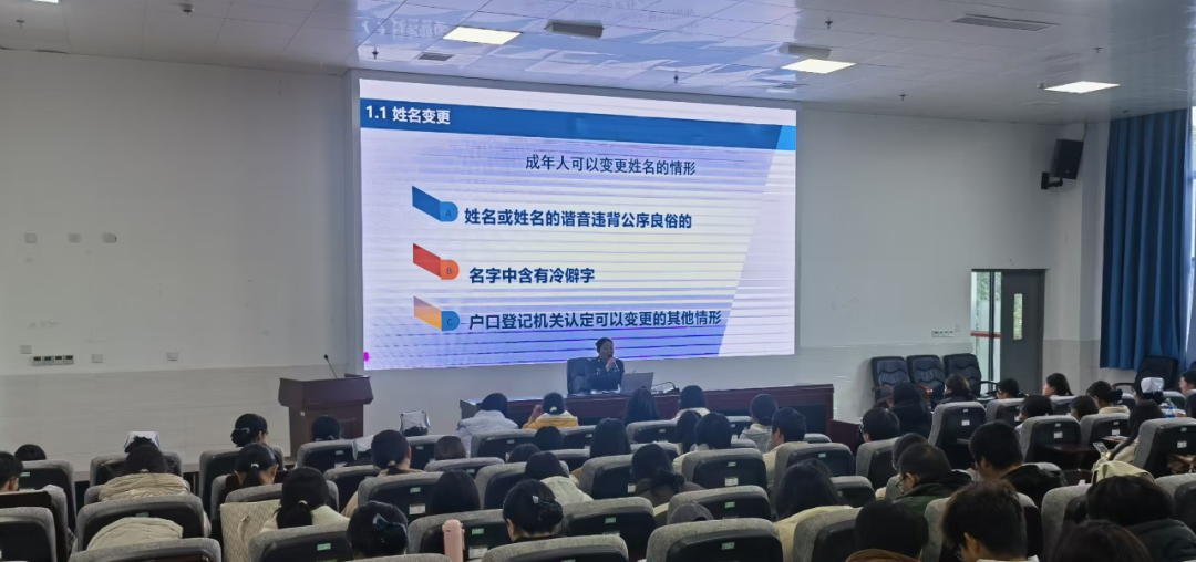 杨婷支队长结合学生实际需求,就便民服务与电诈防护两方面展开讲解。她详细介绍了姓名变更的适用情形、内江市“零门槛”落户政策,并现场推广了“四川公安e码(校园版)”。在防诈骗环节,她通过真实案例揭露了跨境电信诈骗的作案特点及“两卡”“跑分”等黑产风险,提醒同学们增强个人信息保护意识,筑牢安全防线。